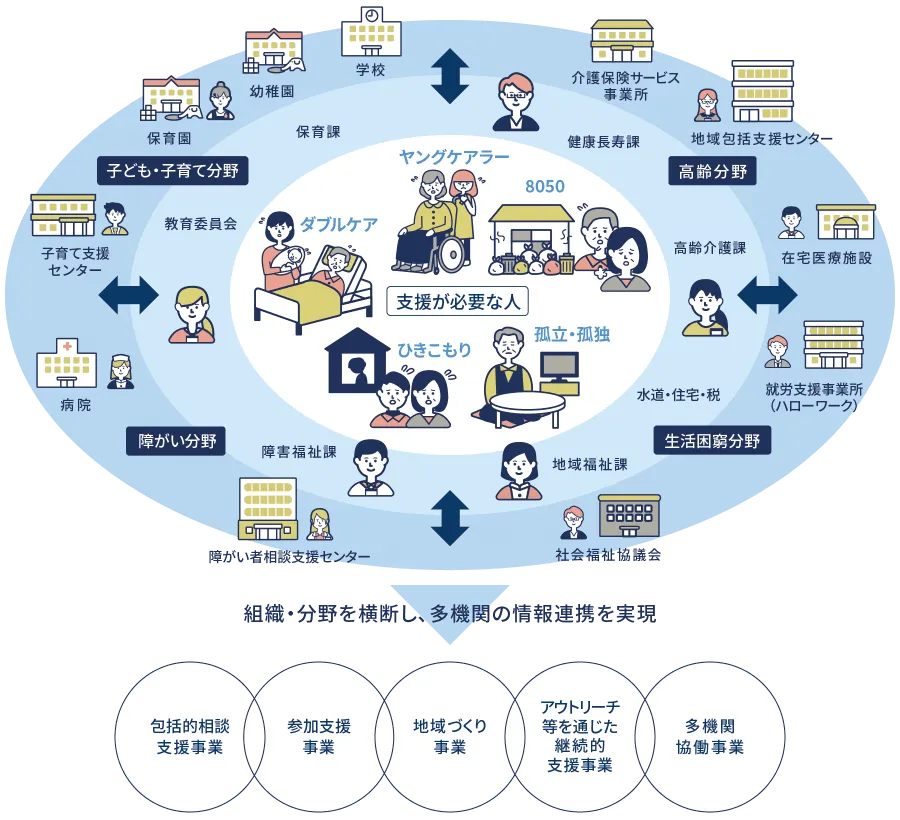 香取市では、2023年4月から新たな「重層的支援体制整備事業」に着手しています。この事業は、ヤングケアラーや8050問題など、従来の枠を越えた支援を必要とする地域住民に対して、行政と社会福祉関係団体が一体となった支援を行うものです。具体的には、「相談支援」「参加支援」「地域づくりに向けた支援」の3つの側面から多様なニーズに対応します。