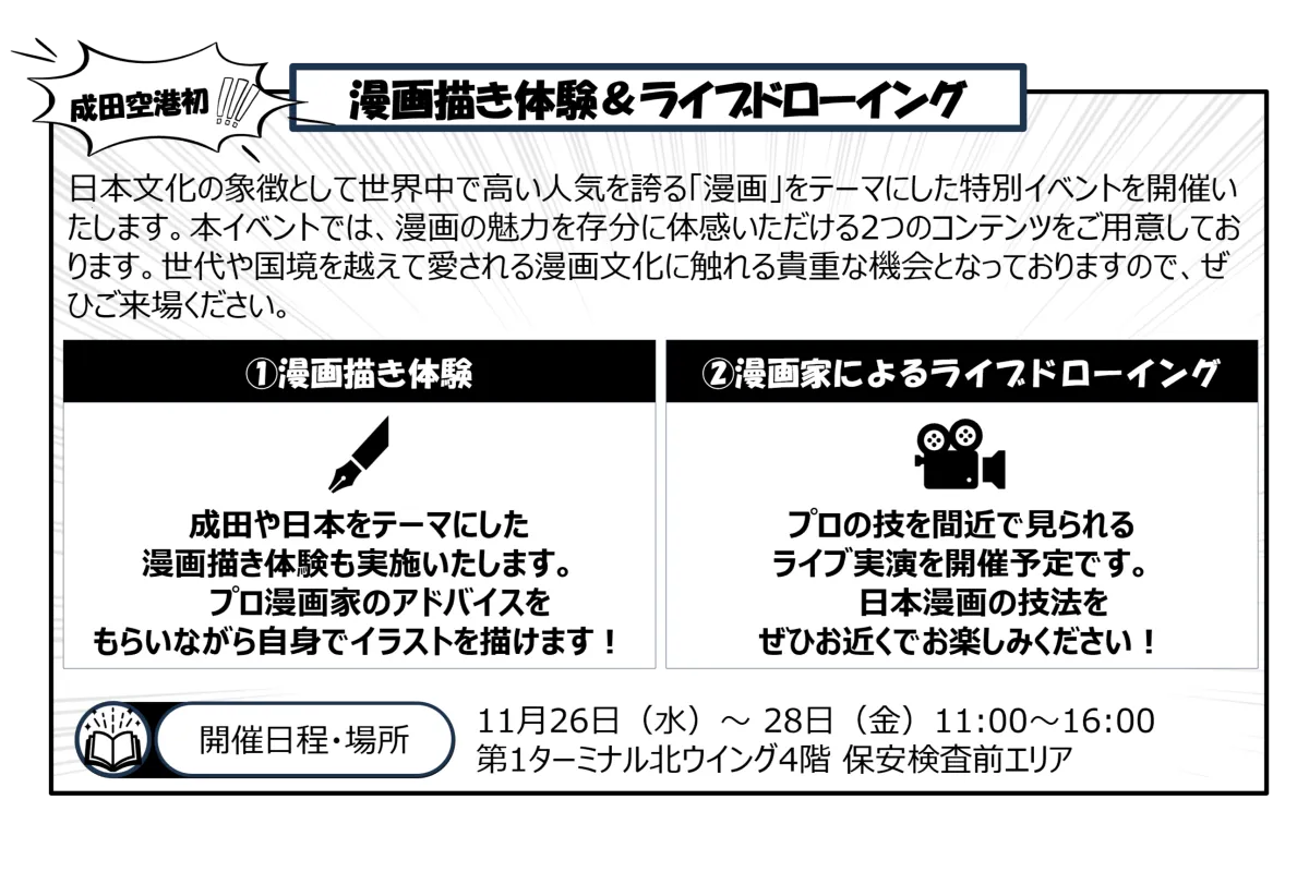 今回の漫画イベントは、成田空港内で初めて行われる試みです。日本の文化を体験し、さらに「また訪れたい」と思ってもらえるよう、さまざまなアクティビティが用意されています。参加者は、気軽に楽しめる漫画描き体験に挑戦したり、プロ漫画家によるライブドローイングを観賞できます。これにより、漫画の奥深い世界や創作の楽しさを実感できることでしょう。
