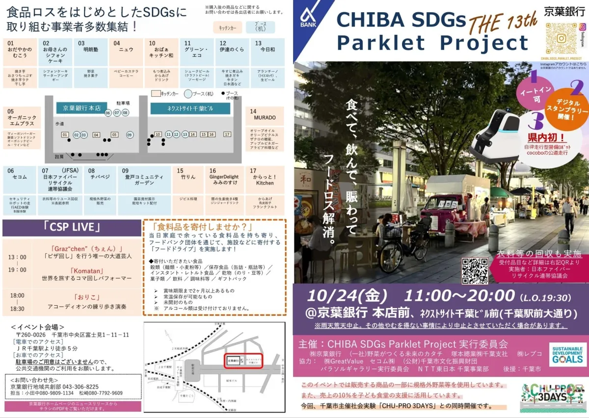 千葉駅前の大通りで、環境に配慮した活動を推進する「13th CHIBA SDGs Parklet Project」が開催されます。このイベントは、食品ロスや地域活性化などの課題解決を目指しており、10月24日から26日までの3日間、様々な出店やパフォーマンスが行われます。特に注目なのは、株式会社GreatValueが提供するまちのDX「HERO」。