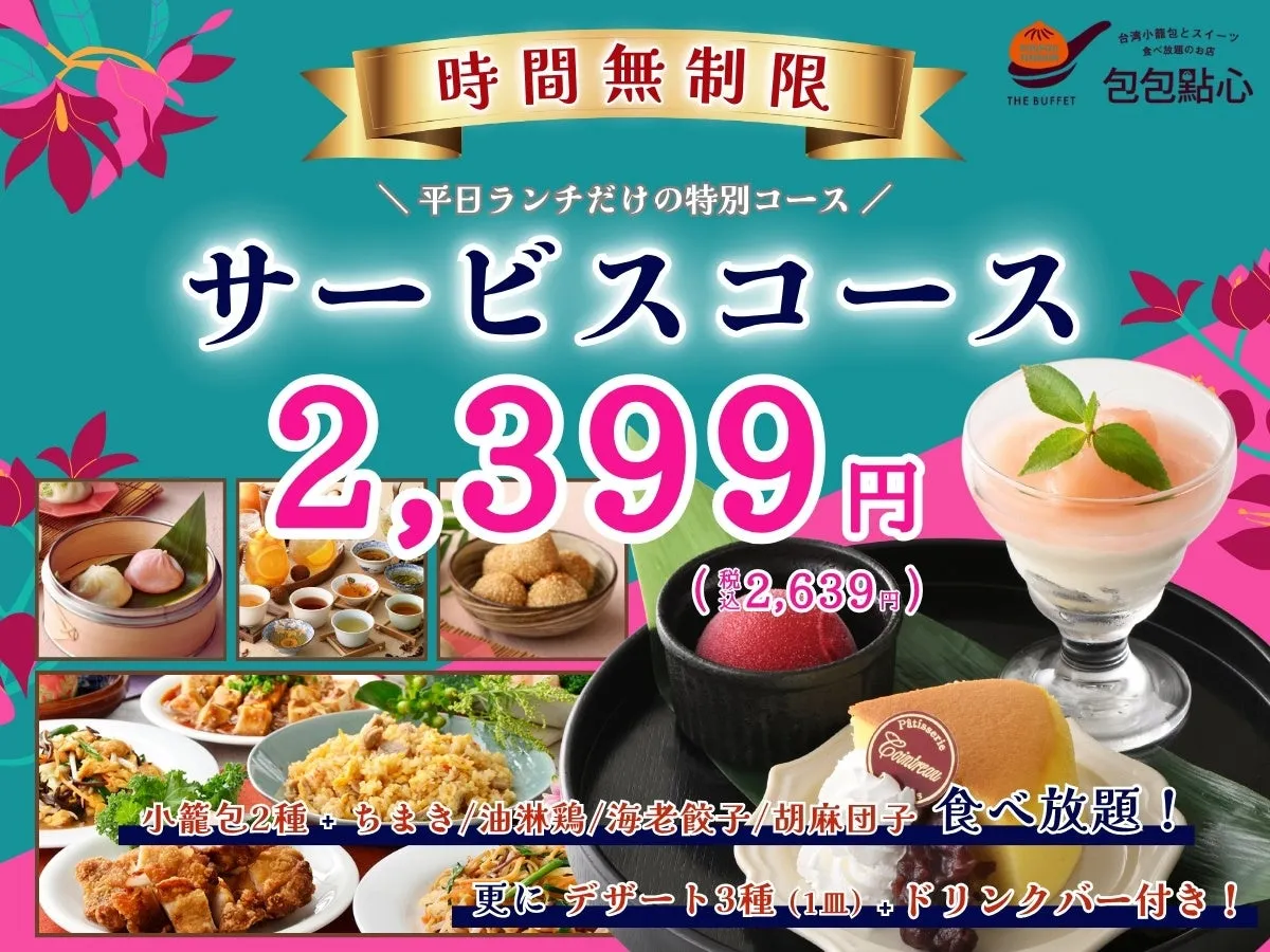 美味しい台湾小籠包と本格中華料理の食べ放題、そしてデザートまで味わえるこのコースを、ぜひこの機会にお楽しみください。皆さまのご来店を心よりお待ちしております!
