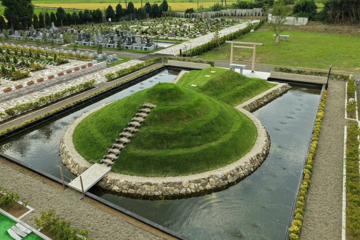 この古墳墓は、野田ほたるローズガーデン内に設置されており、周囲は美しい水濠に囲まれた庭園式霊園です。美しい風景の中で、静かに佇むこのお墓は、単なる墓所に留まらず、地域文化の発信や野田市の新たな観光資源としても重要な存在です。古墳文化を現代に戻す象徴的な役割を果たしていると言えるでしょう。