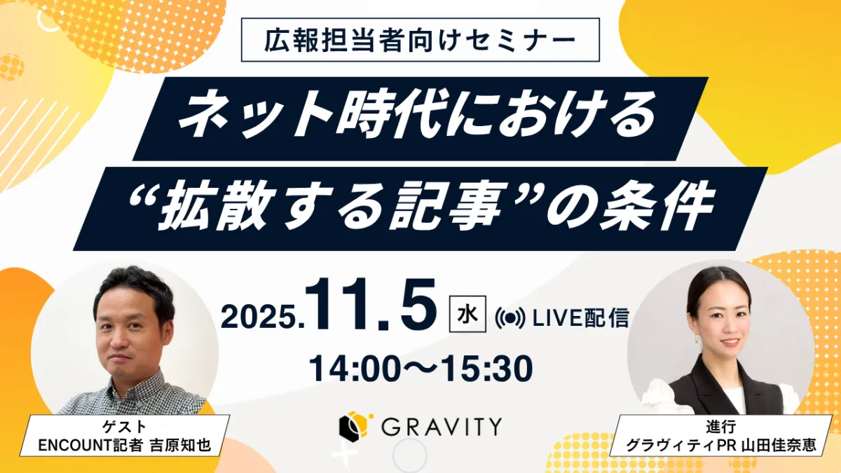 株式会社グラヴィティPRがもたらす最新の広報PRセミナーが、2025年11月5日(水)にオンラインで開催されます。このセミナーは、特に年末年始に向けて企業広報担当者が注目すべき内容となっており、現役記者を招いて「ネット時代における“拡散する記事”の条件」をテーマに深堀りします。