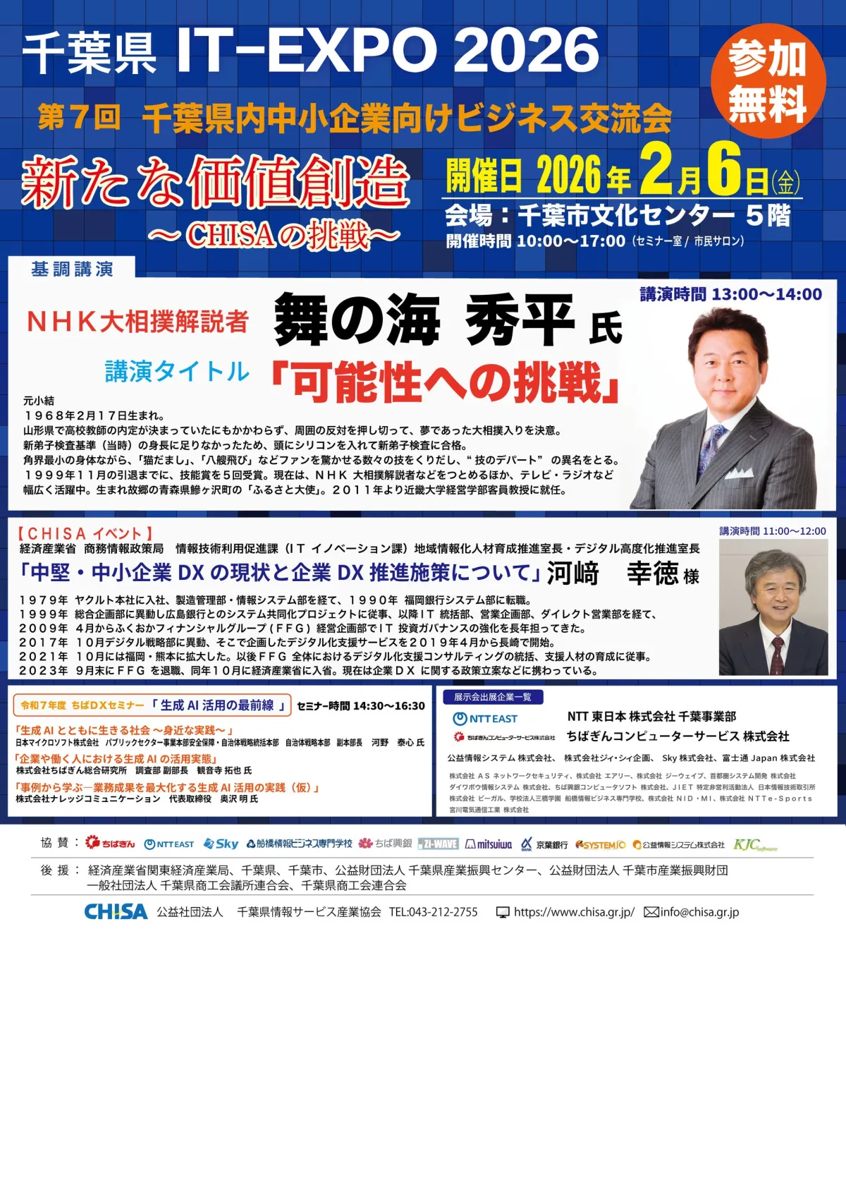 千葉県内の中小企業向けビジネス交流会「千葉県IT-EXPO2026」が、2026年2月6日(金)に千葉市文化センターの5階で開催されます。このイベントは、千葉県情報サービス産業協会(CHISA)が主催し、テーマは「新たな価値創造 ~CHISAの挑戦~」です。