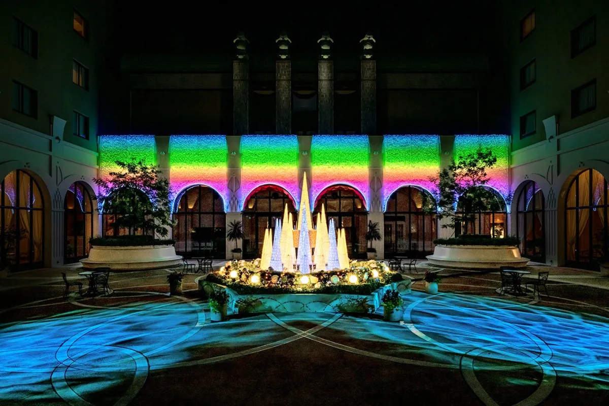 ホテルの中庭「コートヤード」では、中央の噴水が光り輝く湖上の城に見立てられています。水面には美しい光が反射し、幻想的に揺らぐ様子が楽しめます。また、スクリーンのように変化する光の壁が、ダイナミックな視覚効果を提供し、驚きと感動に満ちたフォトジェニックな空間を作り出しています。