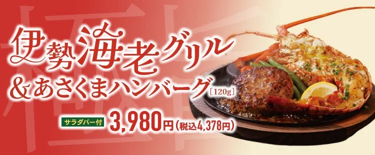 この特別メニューは、120gの伊勢海老のグリルとあさくまの人気ハンバーグが一皿で楽しめます。価格は3,980円(税抜き)で、サラダバーも含まれています。ただし、鶴見店ではサラダバーが無いため、価格は異なりますのでご注意ください。